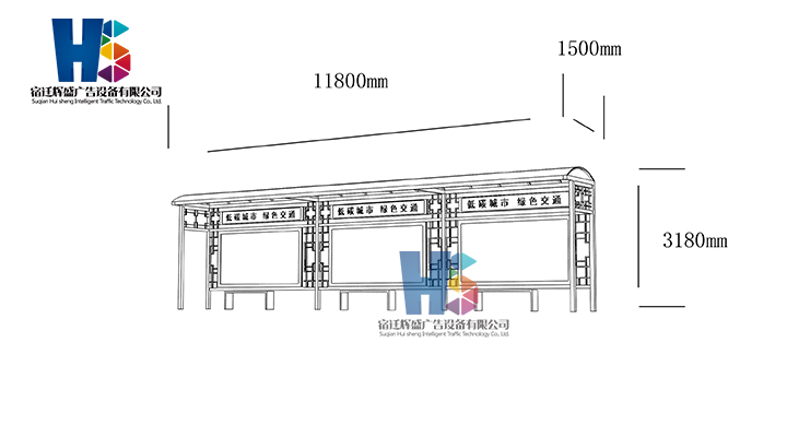 產(chǎn)品外觀 / PRODUCT DETAILS 產(chǎn)品信息 / PRODUCT INFO 【產(chǎn)品名稱(chēng)】:新款候車(chē)亭HS43 【產(chǎn)品系列】:新款候車(chē)亭 【產(chǎn)品型號(hào)】:HS43 【產(chǎn)品規(guī)格】:長(zhǎng)11800mm 寬1500mm 高3180mm 【產(chǎn)品材質(zhì)】:熱鍍鋅鋼板 【使用年限】:10-15年 【詳情致電】:181-5189-0417、157-5170-8886 備注:產(chǎn)品可根據(jù)用戶需求選用材質(zhì)、顏色及配件,個(gè)性化定制。 1、表面采用靜電噴塑(氟碳烤漆/搪瓷處理) 2、頂棚采用100*100*1.5mm、100*150*2mm鍍鋅管,3mm鍍鋅板激光切割件、1.5mm鍍鋅板焊接骨架,鋪1mm鍍鋅板(10mm陽(yáng)光板) 3、立柱采用150*150*3mm鍍鋅管 4、箱體采用1.5mm鍍鋅板折彎焊接成型,門(mén)框采用全玻鋁合金型材,視窗采用6mm鋼化玻璃 5、照明電器采用LED燈粒 產(chǎn)品尺寸 / PRODUCT SIZE 關(guān)于輝盛 / 為社會(huì)分擔(dān)責(zé)任,為客戶創(chuàng)造價(jià)值 宿遷輝盛廣告設(shè)備有限公司是一家集設(shè)計(jì)、研發(fā)、生產(chǎn)為一體的城市公共設(shè)施生產(chǎn)型企業(yè)。主要產(chǎn)品有:候車(chē)公交亭、公交站臺(tái)、閱報(bào)欄、路名牌、垃圾箱、燈箱等市政設(shè)施系列產(chǎn)品和工程配套設(shè)施系列產(chǎn)品,現(xiàn)有高級(jí)技師30多人,高級(jí)職稱(chēng)設(shè)計(jì)人員10人,是一家具有自主開(kāi)發(fā)和設(shè)計(jì)能力的以公交亭、智能公交為主導(dǎo)的綜合性城市公共設(shè)施制造企業(yè)。為了進(jìn)一步改善生產(chǎn)工藝,提高產(chǎn)品質(zhì)量,公司引進(jìn)了先進(jìn)生產(chǎn)設(shè)備,包括立臥式加工中心,工業(yè)涂裝流水線,CNC車(chē)床,線切割機(jī),大型數(shù)控板機(jī),數(shù)控折邊機(jī),數(shù)控沖孔機(jī)床,大型折彎?rùn)C(jī)等。公司還專(zhuān)門(mén)成立了產(chǎn)品研發(fā)部門(mén),現(xiàn)每年自主開(kāi)發(fā)或應(yīng)客戶要求設(shè)計(jì)推出多款新產(chǎn)品。 榮譽(yù)資質(zhì) / ENTERPRISE HONOR